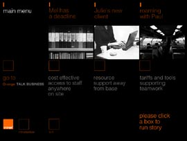 | Area of expertise: Wireless and mobile services Client: Orange, London Three scenarios created and conceived for Orange, focusing on future service concepts for 2.5G wireless services. 1. Mel has a deadline: Cost effective access to staff anywhere on site 2. Julie's new client: Resource support away from base 3. Roaming with Paul: Tariffs and tools supporting teamwork | | Project: Interactive touch screen system Role: Multimedia director Company: MetaDesign |